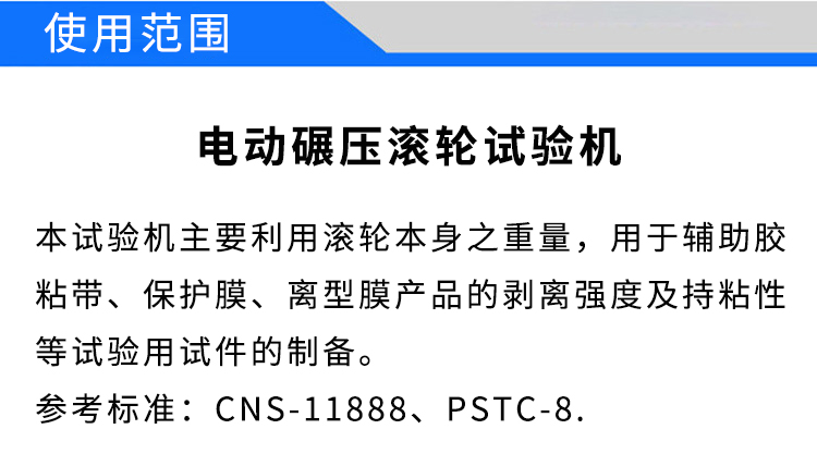 本產(chǎn)品用于膠粘帶剝離強(qiáng)度、持粘性等試驗(yàn)用試件的制備。以固定的壓力及速度,將膠粘帶試樣規(guī)范平整,均勻的粘著于標(biāo)準(zhǔn)的試驗(yàn)基材上。