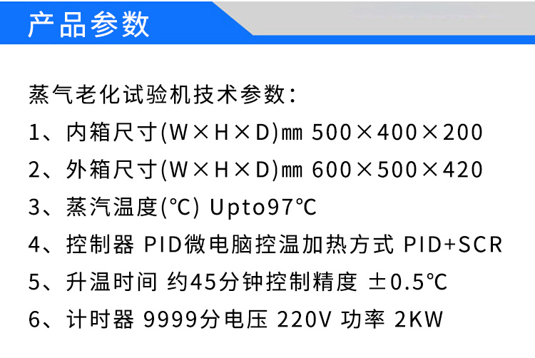 參數(shù)要求:1、內箱尺寸(W×H×D)㎜ 500×400×2002、外箱尺寸(W×H×D)㎜ 600×500×4203、蒸汽溫度(℃) Upto97℃4、控制器 PID微電腦控溫加熱方式 PID+SCR5、升溫時間 約45分鐘控制精度 ±0.5℃6、計時器 9999分電壓 220V 功率 2KW蒸氣老化試驗機特點:1、內、外箱體材質:SUS304不秀鋼制作。外觀美觀,不易老化2、水位控制
